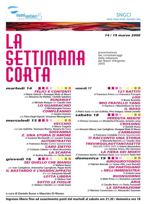 Da oggi presso l’Auditorium del Teatro Bellini di Napoli prenderà il via La settimana corta, la kermesse cinematografica a cura di Daniele Russo e Maurizio Di Rienzo, in collaborazione con il Sindacato Nazionale Giornalisti Cinematografici Italiani, che prevede la proiezione di 20 cortometraggi scelti nella selezione dei Nastri d’Argento 2006 realizzati da giovani cineasti italiani.