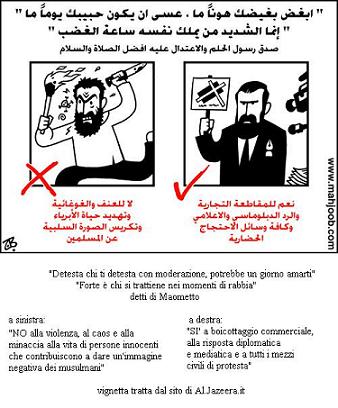 Premessa: non intendo assolutamente giustificare e approvare le violenze compiute da alcuni musulmani in risposta alle vignette satiriche, poiché la considero una reazione profondamente sbagliata e incivile che va a ledere l’immagine stessa del popolo musulmano agli occhi del resto del mondo.