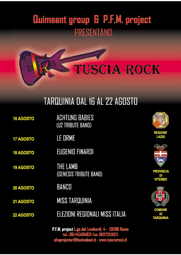 Il 17 agosto i irflettori si accenderanno sul concerto delle LE ORME ed il 18 sarà di scena EUGENIO FINARDI. Per il 19 e 20 agosto è prevista la partecipazione dei THE LAMB (GENESIS COVER BAND) e dell’indimenticabile BANCO del Mutuo Soccorso. La manifestazione avra epilogo il 21 ed il 22 con l’elezione di Miss Tarquinia e le elezioni regionali di Miss Italia.