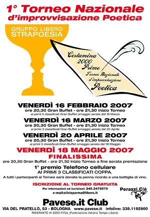 “Con questo torneo – dicono gli organizzatori Silvia Parma e Lupo Angel – abbiamo voluto unire la Tradizione Oratoria e Poetica con quella della convivialità e dello scambio culturale. Per questo abbiamo scelto il Circolo Pavese, storico ricettacolo di cultura alternativa (culla di artisti come Patrizio Roversi e Susy Blady, I Gemelli Ruggeri, nostri ospiti, e Vito, per esempio) e della vis poetica oltre che ironica.Vi aspettiamo numerosi per ritrovarci a condividere una delle sfide più entusiasmanti: quella della parola e del verso recitato che altro non sono che il confronto tra gli uomini ed il loro sentire.”