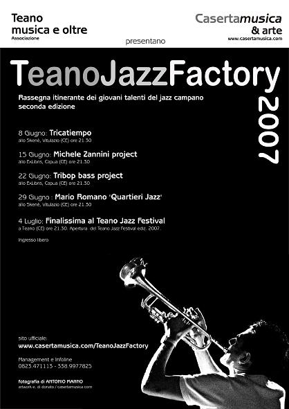 Quattro i gruppi in gara che si contendono la possibilità di esibirsi a luglio sul palco del Teano Jazz Festival nella finalissima del concorso e di partecipare gratuitamente ai seminari “Teano Jazz Workshop”. Ma per i gruppi emergenti più interessanti della nostra provincia c’è anche un’altra novità: a luglio verrà pubblicato il cd antologico della manifestazione prodotto da Casertamusica Records, che includerà le registrazioni di tutti i gruppi che hanno partecipato a questa seconda edizione. – Lo scopo e il motore della manifestazione, – dichiara Angelo Agnisola, presidente dell’associazione Casertamusica – è di valorizzare quanto più possibile la scena musicale in ambito jazz, creando degli spazi alternativi allo sviluppo di progetti artistici giovani, con particolare attenzione alle forme espressive innovative. Sul sito internet www.casertamusica.com/teanojazzfactory sono disponibili il calendario completo e tutte le informazioni relative alla manifestazione che si concluderà con la finalissima del 4 luglio sul prestigioso palco del Teano Jazz Festival, giunto quest’anno al traguardo della quindicesima edizione.