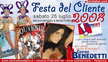 Sabato 26 luglio, dal pomeriggio fino a tarda sera, si rinnova l’appuntamento con la Festa del Cliente del Centro Benedetti, a Tarquinia, nel piazzale antistante la struttura commerciale.