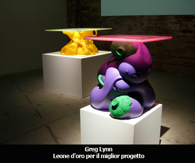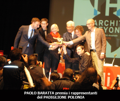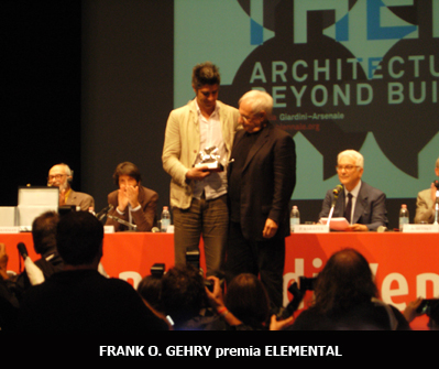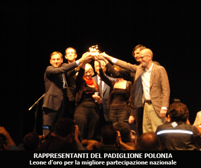 A seguito della consegna dei due Leoni d’oro, voluti dal Cda della Biennale, la cerimonia ha continuato la premiazione con la consegna dei premi assegnati dalla giuria internazionale. Il Leone d’oro per la migliore partecipazione nazionale, consegnato dallo stesso Paolo Baratta, è stato dato alla Polonia, con il padiglione “Hotel Polonia”. Nelle motivazioni della giuria viene esaltata la capacità del padiglione di combinare arguzia, intelligenza ed ecologia, in un progetto che propone il ciclo di vita degli edifici all’interno delle città contemporanee. Tra arte e manifesto di architettura, il padiglione ha risposto sensibilmente ai problemi della propria nazione. A Greg Lynn è stato assegnato il Leone d’oro per il miglior progetto; a premiarlo, Aaron Betsky. “Lynn – afferma Baratta – coi i suoi mobili sperimentali, con i suoi giocattoli riciclati, ha risposto pienamente alla richiesta della Biennale. Il suo lavoro pur restando una provocazione, non ancora un prototipo, spinge la ricerca digitale ad un nuovo livello, ponendo l’attenzione sul riciclo e sulla salvaguardia dell’ambiente”. In ultimo, l’ incontro tra due architetture quella grande e solida, e quella giovane e curiosa. Frank O. Gehry ha consegnato il Leone d’ argento per un promettente giovane architetto al gruppo Cileno Elemental, premiato per aver evidenziato i problemi di ambiente e povertà legati al mondo agrario, per aver incoraggiato quest’ atteggiamento etico e per la sensibilità rivolta a tale contesto fino alla realizzazione di un’ opera a basso costo.