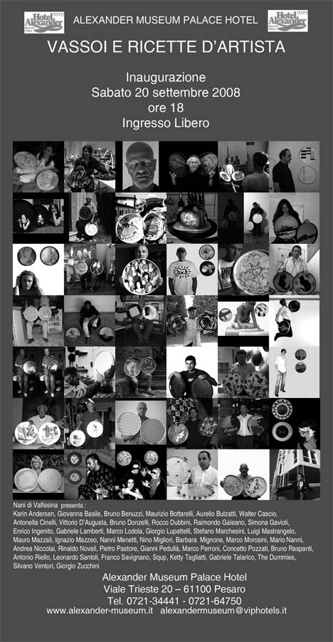 Pesaro come protagonisti di una collettiva che prende in esame la relazione fra il cibo e l‘arte. Gli artisti in mostra hanno utilizzato una coppia di vassoi per vivande come supporto per le loro creazioni, sublimando in questo modo il loro significato e trasformandoli in supporto per